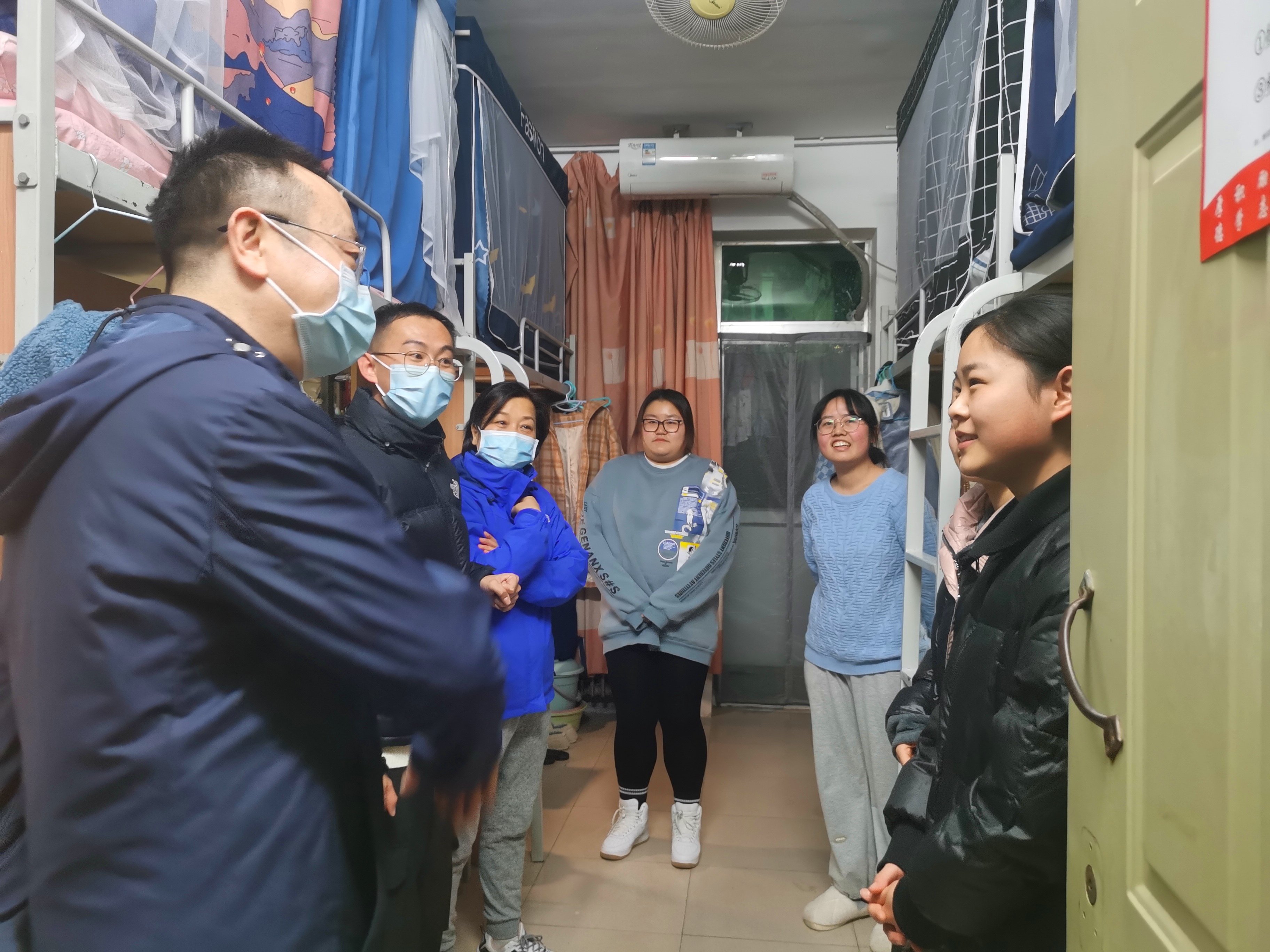 靳春泓和陈煜一一走访每个宿舍,与同学们亲切交流,了解大家的近况,还细致询问了同学们学校管控之后的生活适应情况和复习进度等,就同学们普遍关注的问题进行解答。
