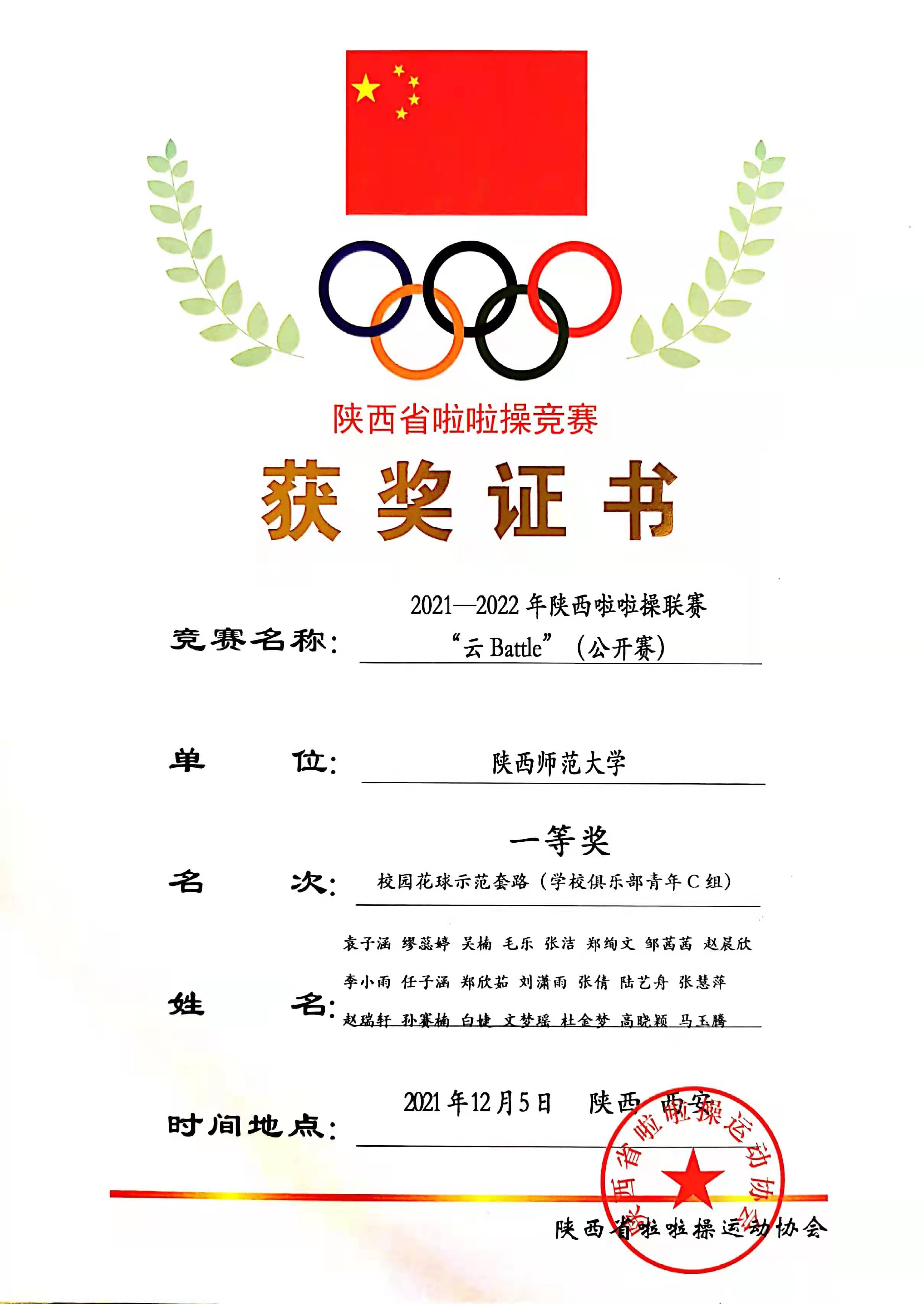 12月4日,由陕西省啦啦操运动协会主办的2021-2022年陕西省啦啦操联赛“云BATTLE”公开赛开赛,来自西安、咸阳、延安、商洛等各地市的300多支队伍6000余人次共聚云端,我院和化学化工学院组成的啦啦操队在大赛中获得学校俱乐部C组一等奖。