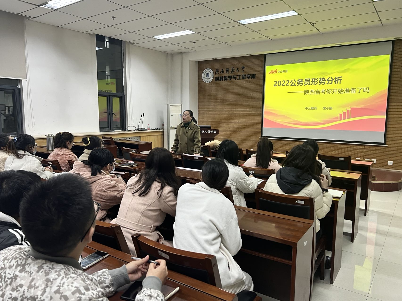 为帮助拟于2022年报考国家公务员的应届毕业生全面了解公职类考试,引导和帮助同学们积极备考,公司于12月6日晚7时在致知楼2307会议室举办2022年公考培训指导专题讲座,主讲人为中公教育资深讲师常小娟老师。