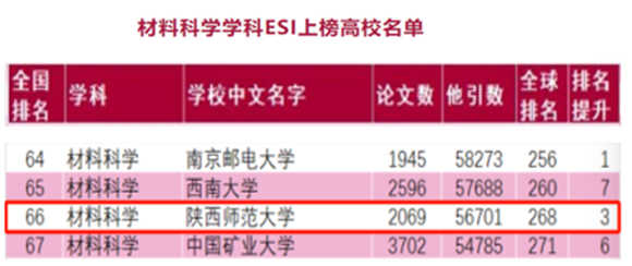 在此次统计范围内,学院共有78篇高水平论文入选ESI高水平论文,占全校入选论文38%(学校共入选204篇)。在材料科学学科ESI上榜高校名单中,公司在全国排名第66位,世界排名268位,上升位次3。