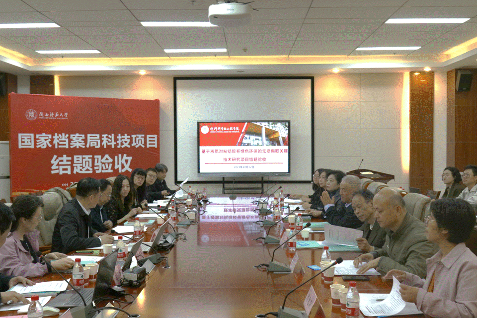 10月12日,国家档案局科技信息化司组织专家在学校致知楼1568会议室对李玉虎教授团队承担的“基于液氮对粘结胶卷绿色环保的无损揭取关键技术研究”(项目编号:2017-B-01)、“档案盒中虫霉因素的检测技术研究”(项目编号:2018-B-001)两个项目进行验收,验收会议由国家档案局科技信息化司王燕民司长主持。验收组专家由陕西省档案馆副馆长解华波、沈阳市档案馆技术保护部部长徐卫红、中国第二历史档案馆技术处副处长孙骊君、陕西科技大学原副董事长张美云教授以及秦始皇帝陵博物院周铁研究员等组成。国家档案局科技信息化司科技管理处副处长姜雪、陕西省档案馆二级巡视员汪明哲、业务处处长闫英帅、科研所所长张艺、副所长段金红、陕西省委办公厅(省档案局)档案事业发展处副处长于洋宁等 ,学校实验室建设与管理处处长李保新、科学技术处副处长曹晓仪、学院领导班子和教师代表等出席了会议。