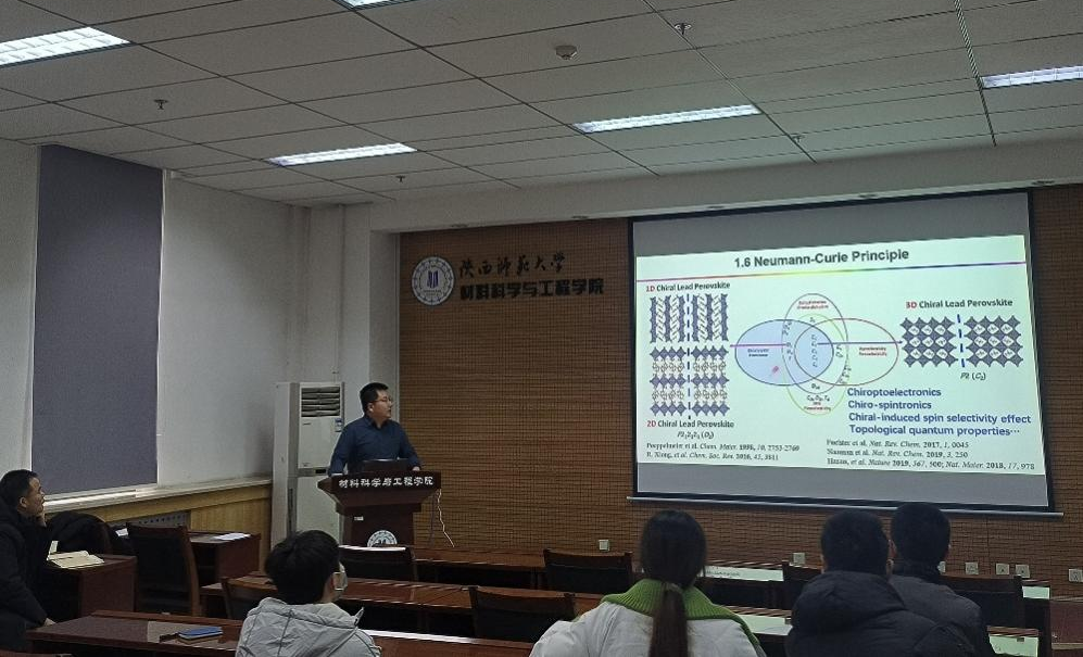 龙官奎研究员以“手性钙钛矿材料的开发及应用”为题,讲述了手性材料在圆二色性、圆偏振发光、非线性光学、自旋电子学和铁电性等方面的特殊物化性质,详细介绍了通过将钙钛矿材料和手性材料相结合,所制备手性钙钛矿在光学、电学及自旋性能方面的优异特性以及在光探测器、量子光学、生物响应成像、自旋电子等方面具有重要的应用价值。龙官奎研究员分享了其课题组通过传统化学合成方法以及微纳加工方法在手性钙钛矿设计与合成方面的研究工作,展示了锗基与钌基手性钙钛矿在手性光电子学和自旋电子学方面的研究成果,细致分析了基于理论计算指导手性钙钛矿分子构型设计的研究方法,为制备具有优异光学性能的新型手性材料提供了新的见解。同时,报告中龙官奎研究员还基于自身的科研经历与感悟,为在座师生的科研和学术工作提供了建议。